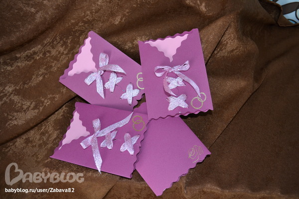 Ну и напоследок простенькие приглашения, делали в двух цветах, выкладываю только в одном - розовом, а еще делали в шоколадном с разными лентами из парчи: шоколадной, золотой и розовой. Моногорамку я сама придумывала... долго, но ею я оч довольны. Писали золотой гелевой ручкой