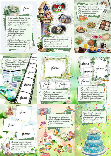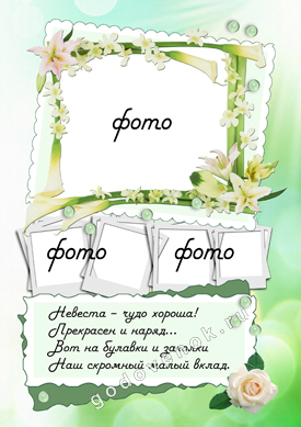 Я купила магнитный альбом А4 формата, и вложила в него распечатанные листы коллажи. Первый лист получился "титульным", а в последующие листы вложила с правой стороны коллаж с стихотворением и фотографиями молодоженов, справа - деньги.