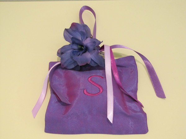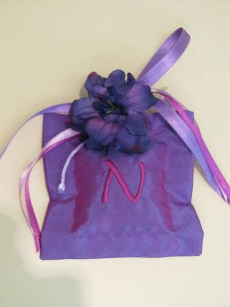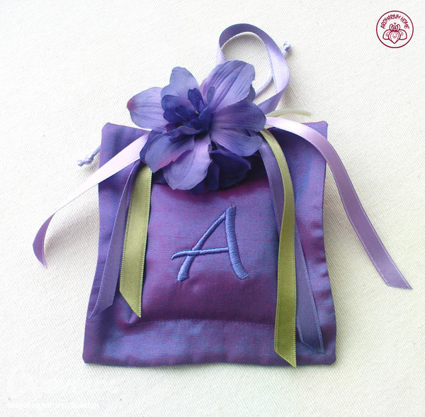 Подвесные саше с вышитыми инициалами, украшенные цветками дельфиниума .