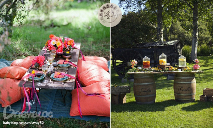 Свадьба в начале июня. Народу планируется немного. Организовывать будем сами. Первый вопрос: стол и где сидеть. Есть мысль привезти на место пикника доски и из них сколотить стол, а для нарядности постелить скатерть. А сидеть на скамейках там же собранных. Но куда потом девать это все? Разбирать или оставить? Еще есть вариант: устроить классический пикник. А чтобы он отличался от обычного - украсить пространство вокруг шарками,ленточками.