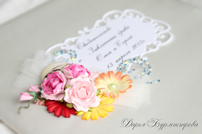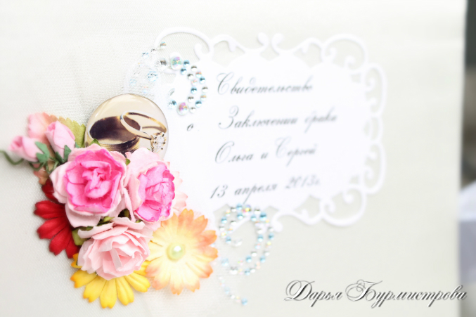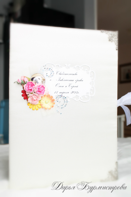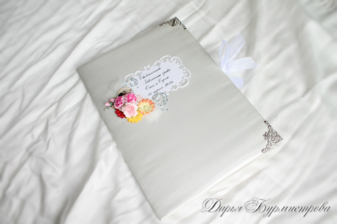 Папка из атласа стандартного размера,накладные металлические уголки,внутри пивной картон 2мм для жесткости.Свидетельство вставляется в файл.Внутри влева место под большое фото 15х21,справа для стандартного фото 10х15,и табличка для записи.