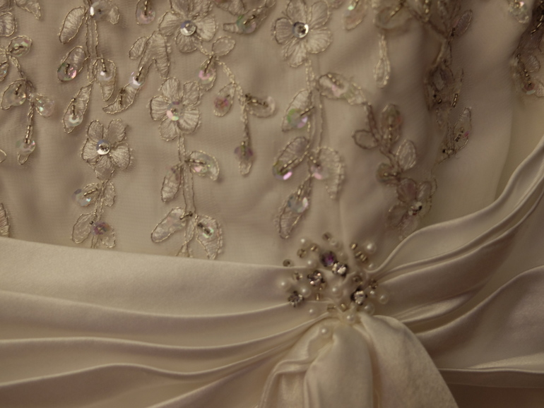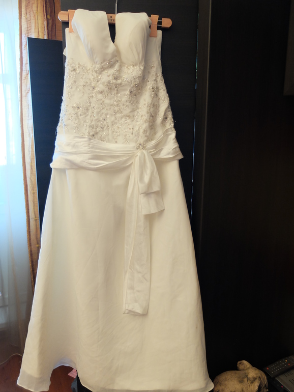 Свадебное платье, сшито по меркам в Китае (там сшито все, что дешевле 30 000 руб., не думайте, что это плохо). Покупалось на смену основному свадебному платью, но так и не было надето. Мы не рассчитали время, опоздали в ресторан и пришлось ехать в аэропорт через 2 часа после начала банкета.