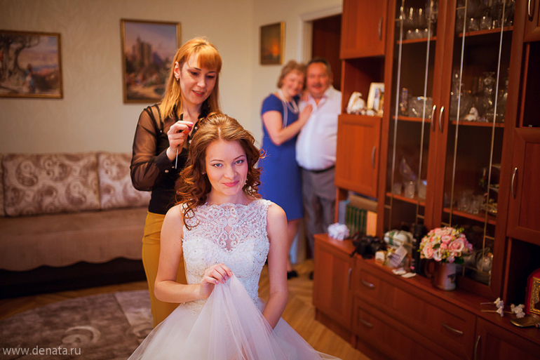 Чтобы макияж и прическа держались хорошо в течение всего дня, самое главное выбрать правильного мастера. Здесь все будет зависеть только от меня. Макияж также как и платье надо уметь носить. Не стоит постоянно опирать лицо руками, иначе вы смажете румяна. Надо настроиться, что вы должны правильно носить и платье, и прическу, и макияж в день свадьбы. Я всегда знаю, как и что я закрепила в прическе, как и что будет держаться, но и от невесты многое зависит.