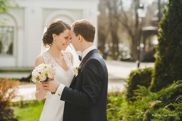 Прическа: Низко собранные локоны, с объемом, специально созданным для того, чтобы не скрылась красота прически и фаты.
