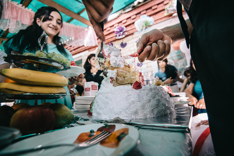 На свадьбах и других празднествах угощение состоит из риса и мяса. (Для этого для свадьбы специально режется несколько баранов либо телят.) Советские курды празднества устраивают в военных палатках, садятся там они на деревянных скамейках и едят за деревянными столами. На одну из стенок палатки, за спинами новобрачных вешают самый красивый ковер. При этом следует отметить, что курды сохраняют патриархальный обычай: и мужчины и женщины празднуют свадьбу порознь в различных палатках. Мужчинам прислуживают юноши.