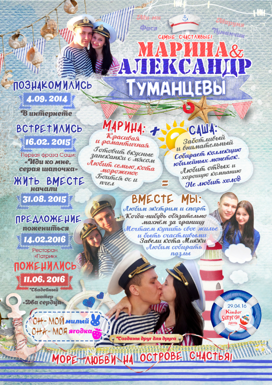 Так как он посвящен сразу двум людям, в нем указаны знаменательные для них даты, краткую информацию о них в отдельности, а также их общие планы и мечты.