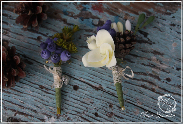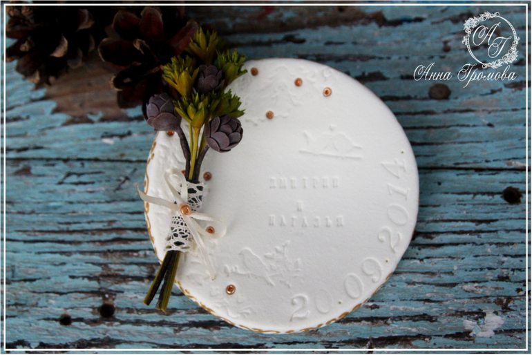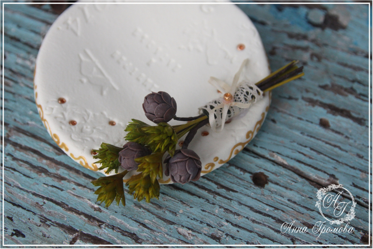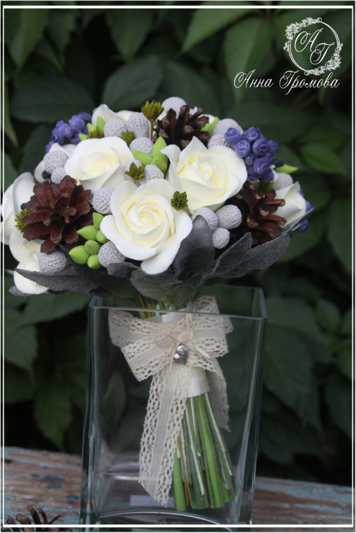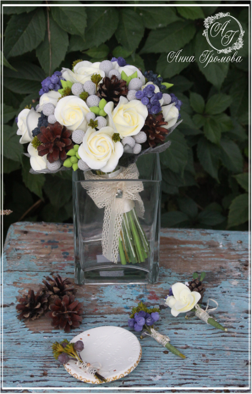 Букет невесты (НЕ РЕКЛАМА)Букет невесты, бутоньерка для жениха и сына и тарелочка для колец. Декорировано кружевом, лентами и серебряными подвесками.