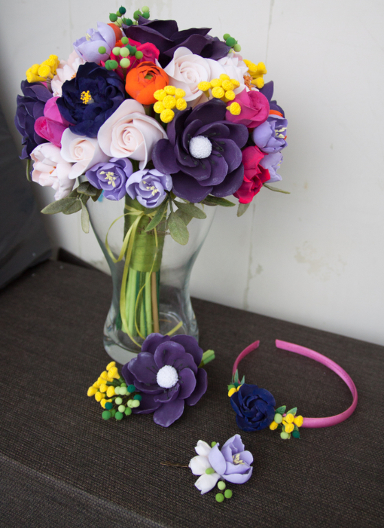 На фото букет ручной работы для очень яркой свадьбы+ бутоньерка, заколка и ободок для дочки.