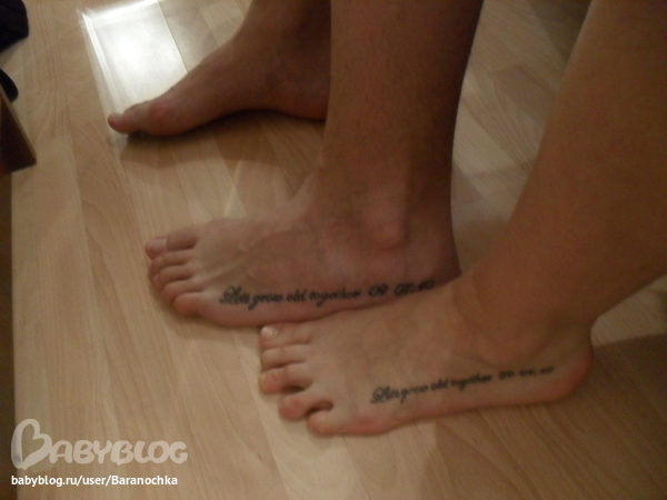 у нас с мужем есть по две татушки: одна на правой ноге браслет на щиколотке One Love - One Life и имена друг друга, (на фотке правда, видно плохо)