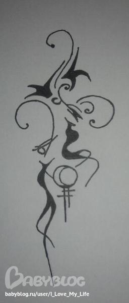 Рисовал ее маркером для дисков,несколько увеличив масштаб,я хочу немного поменьше)))Потом еле оттерла,но самим видом тату осталась довольна.И все это часть мечты,а реальность такова:спросила я у мастера,что делала это тату,есть ли какое-либо значение или это просто задумка.На что она ответила,что есть,и это тату означает символ однополой любви.Ну пипец,приехали,я очень расстроилась,ведь мне так понравился рисунок,а значение как бы не по моей ориентации,даже не в том дело,какое отношение у меня к однополой любви,просто как посмотрят на это знающие о теме люди.А с другой стороны многие тату,что делают сейчас,раньше имели не очень положительные значения да и я делаю ее для себя,а не кого то.....Вот же ж,я на распутье,очень хочу такое тату и в то же время у меня уже появились к ней сомнения.....