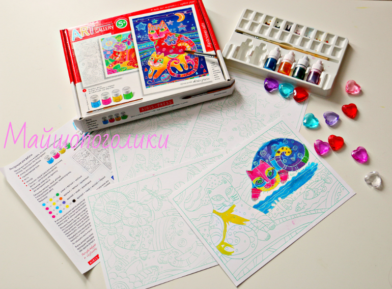 В наборе 4 баночки с красками..палитра и 4 рисунка по теме) Листочки плотные...и с очень крутым контуром...он как то волшебно нанесен...у ребенка выходит шикарная работа) Варя раскрашивала 3 дня но завершила...все сама...я только краски смешивала! Вот единственное...я не уверена что нам хватит красок...ну или может это пока так кажется)