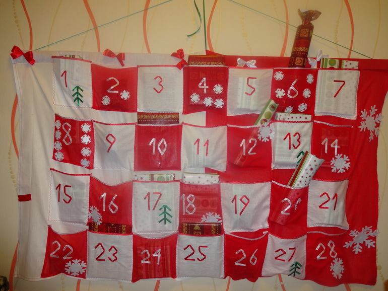 В прошлом году первый раз делали для сына такую штуку, делали без заданий - смысл в заданиях для трехлетки? Делали классический - сразу заполненный подарками на каждый день декабря. В качестве интеллектуальной нагрузки - на календаре есть счет до десяти и раскладка по неделям. Вот так это выглядело в готовом виде :)