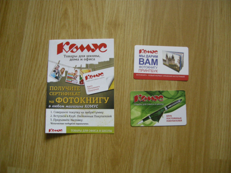 Недалеко от меня находится магазин "Комус". Периодически рядом с ним выдают листовки. Фотки прилагаю-там сама листовка, карта покупателя (выдавалась раньше на кассе, сейчас наверное также) + сертификат на фотокнигу. О сроках ничего сказать не могу, так как не нашла такой инфы.