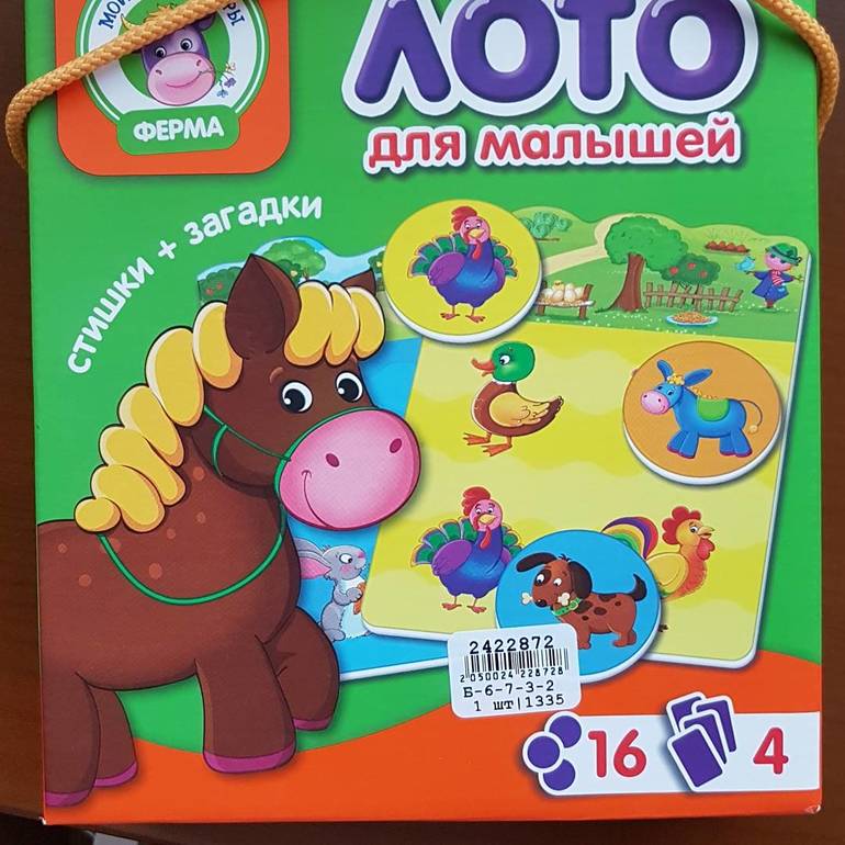 Заказала дочке лото Ферма. Качество очень хорошее. Плотный картон и яркие цвета. Возраст указан +3, но моя в 1.3 уже собирает. Лото поможет выучить малышам зверей и соотносить цвета.