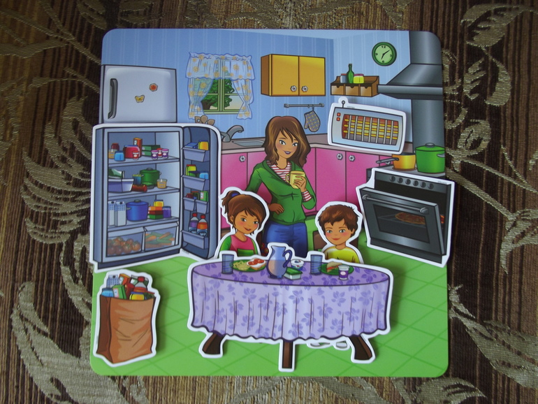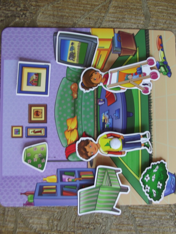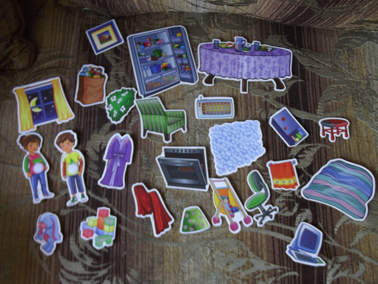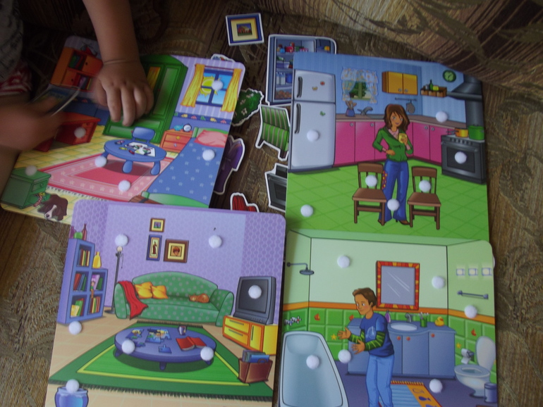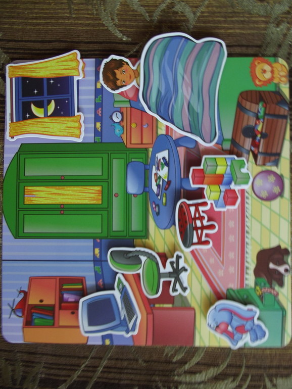 Все элементы сделаны из водонепроницаемого и неубиваемого материала, на надежных липучках.Так что подходит совсем маленьким малышам. Дети учатся создавать собственный интерьер в разных комнатах. Развивается мелкая моторика,творчество,воображение,распознование и сопоставление.Учимся составлять истории по картинке.Нам очень нравится!