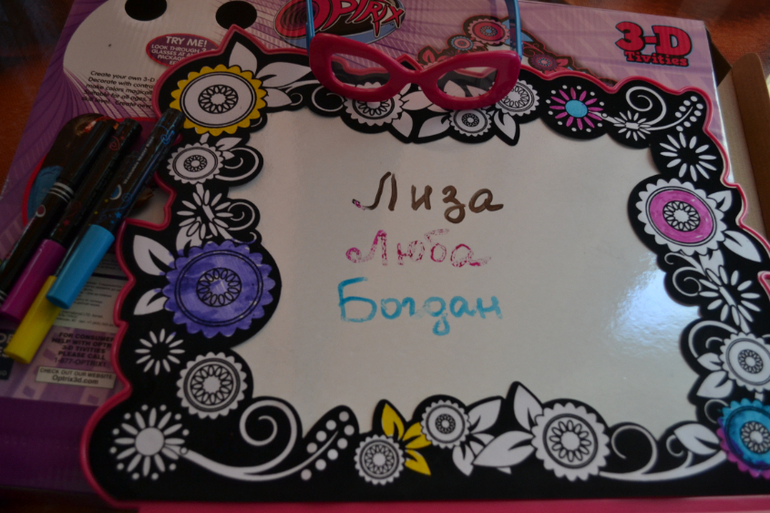 На нее были жалобы - плохо фломастеры пишут. Да это так! Но нормальными (у меня водные разноцветные crayola) - ОТЛИЧНО! (фотки правда не делала, но думаю мне тут на слово поверят)))) В целом - очень довольны))) Докрасили красиво, доска пошла по назначению, очки - ну вроде норм...