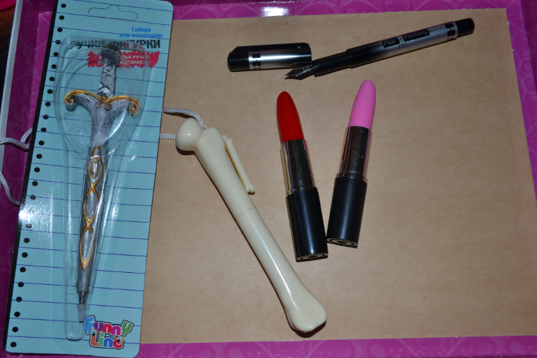 9. Ручки все ОТЛИЧНЫЕ! Еще брали "шприц" - подарок врачу))) но забыла фотку сделать. Гитара и меч - красивые))) Ждем зонтик)))) Кость - сын в восторге))) С помадами - девочки носятся (взяли многие по 2-5 штук). Ручка с пером - моя мечта сбылась)))