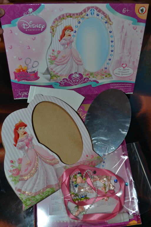 2. Зеркало (118р). Я не оценила совсем. Честно, думала что основа пластик, а не картон... Все-таки дисней... Склеивала его Я!!!! Большую часть деталей приклеила с трудом на супер-клей. Т.е. "по назначению" - поделка ребенка, у нас не пошло... Само зеркало - хорошее (отражает нормально). Результат, хотя и картонный, но симпатичный... Стоит ли этой суммы - затруднюсь ответить (я бы зная, не купила).