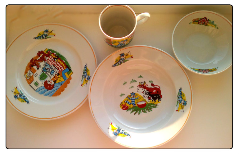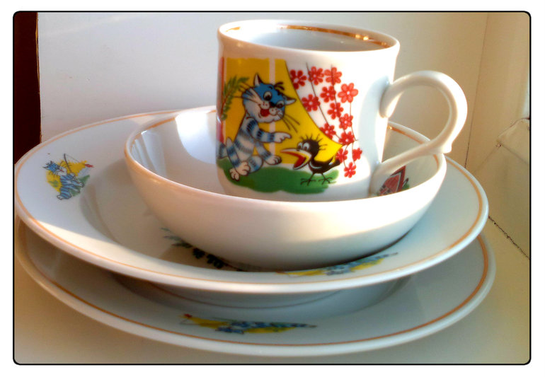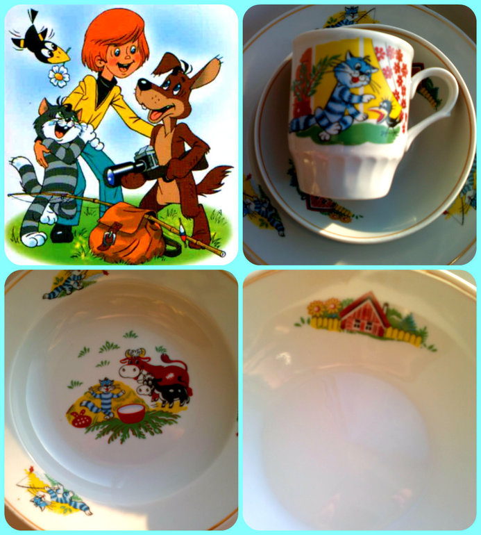 А давайте хвастаться))))))))))Только что сходили забрали. Сынуля подрос и я решила поменять ему пластиковую посуду на настоящую фарфоровую)) Увидела здесь Оксанин пост про наборы посуды и очень она мне понравилась)) Ваняша любит мультик про Простоквашино, поэтому выбрала именно такой: