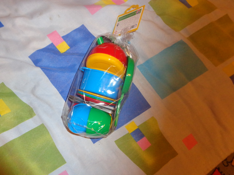 Еще, очень похожую посудку у нас бабушка купила, не соврать- 4 года назад точно!!!! Там вроде как такие же чашки, все на подносе стоит, + вилки и ложки ( такой толстенный пластик), моя даже в 10 лет в этом году с посудой " заковырялась", а еще в Фикс-прайсе за 39 офигенные формы для торта ( песочного, в плане из песка), мальчишкам может и не актуально.... Но все- таки, я вообще из далека подумала, что настящая силиконовая, а оказалась для песочницы, здоровая такая да еще и лопата в комплекте!Ps точно, рассмотрела у вас ложки, да такой же набор только еще с подносом :)))))