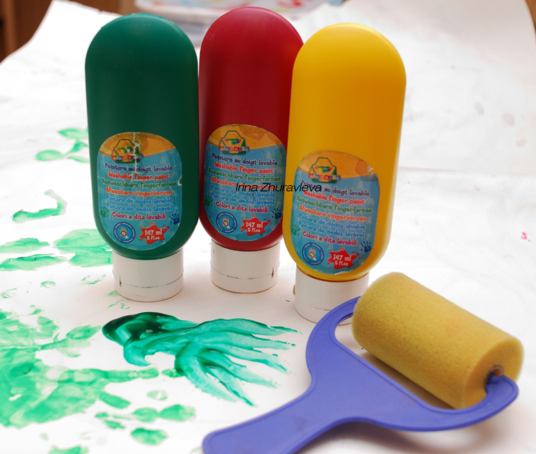 Первыми у нас были (и до сих пор остались) Crayola - в тюбиках не очень удобно, что ребенку не обмакнуть пальчик, но мы сами выдавливали ему на руку,а деть размазывал. Потом уже придумали в тарелочки понемножку,чтобы обмакивал пальчики и рисовал. Эти краски у нас очень давно куплены в 11 мес ребенкиных, т.е. им уже почти 2 года! закончился только синий цвет,т.к. самый любимый, в этих тюбиках еще немного краски осталось. Мы не часто рисовали и дозируем,чтоб экономно расходовать)). Консистенция красок гелевая, более жидкие,чем Jovi. На фото в сравнении зеленый цвет Крайола (густо) и Джови (слева). Очень любим валиком рисовать,обмакиваем его в тарелку с краской и на ватмане творим:))