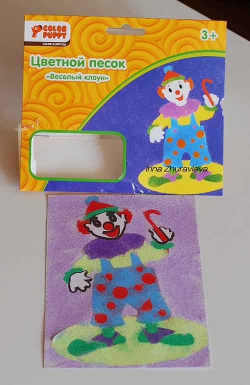 Набор для творчества "Цветной песок" - в ассортименте, нам достался клоун. С сыном 2,9г первый раз такую аппликацию делали, всю до конца за раз, понравилось ему.:)