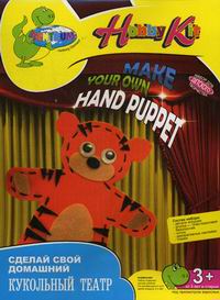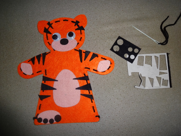 Весь контур куклы-перчатки перфорирован, так что прокалывать фетр не надо - только вводить иглу в дырочки. Василек честно прошил почти половину, я ему помогала, занятие все же монотонное, хоть и не долгое. Потом с визгом и писком мы наперегонки наклеили все лапки-полоски-глазки и кукла готова! Занятие примерно на 30 минут. Кукла небольшая - как раз на детскую ручку, поэтому главный кукловод у нас Вася - и ему это нравится :)