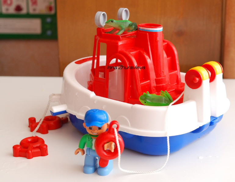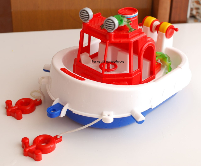 Подарили сыну на НГ такой вот кораблик. Пластик добротный,качественный, в ванной очень понравилось играть, фигурки волка и зайца из ну,погоди туда ставили и других зверушек. Якорь разматывается, верхняя часть кораблика снимается, можно просушить его после купания.