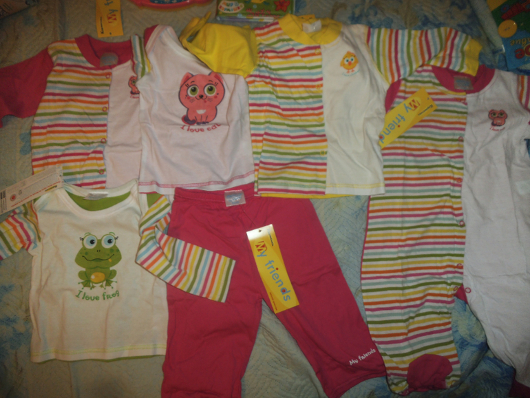 И наша одежда с распродаж в риде и майшопе...Мне она вся большемерной показалась, осбенно брюки...ну совсем огромные...размеры 86-92-98, от Курносиков одежда 80 размера, но тоже очень большой показалась...сейчас мы 74 носим...