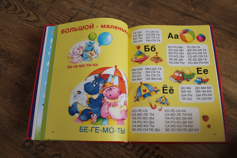 очень большой, около 115 ст, красочный, все стишками. По нему можно выучить алфавит, начать складывать слоги, и далее читать