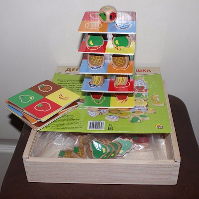 Спасибо Леночке за фото) ![]() Фруктовая башня» - это яркое, аппетитное детское лото, изготовленное из натурального дерева и покрытое безопасными красками. Оригинальная интересная игра-лото представляет собой набор фигурок фруктов и карточек с изображениями этих фруктов - банана, клубники, апельсина, винограда, ананаса, груши, а также один кубик с рисунками таких же фруктов на гранях. На каждой подставке изображены четыре фрукта. Правила игры: в начале строим башню из карточек и фигурок (расставляем фигурки фруктов на соответствующие картинки подставки, сверху кладем карточку, на нее снова фрукты и так до конца, пока не расставим все элементы). После этого каждый игрок (лучше, чтобы игроков было не более 4 человек) бросает кубик и убирает из башни выпавший фрукт. Игрок должен сам определить, из какого ряда нужно убрать фигурку, ведь его основная задача - не разрушить башню. Проигрывает тот, кто разрушит башню. У игрушки есть много вариантов игр. Можно просто разложить подставки на столе и ставить на них фигурки фруктов, которые выпали на кубике. Можно делать то же самое, но усложнив задачу тем, что в игре одновременно находится только одна подставка, ее надо заполнить фруктами, соответствующими картинкам и только тогда можно сверху на фигурки поместить следующую подставку. Также можно делать фруктовые салаты для кукол, строить и разрушать башни и просто расставлять фрукты на соответствующие картинки, если ребенок еще слишком мал для игры в лото. Игра развивает логическое мышление и координацию движений, мелкую моторику, внимание и усидчивость. В игровой форме ребенок запоминает названия фруктов, учится различать цвета. При помощи фигурок фруктов можно обучать ребенка счету. |