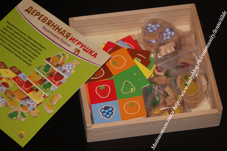 Потрясающая многофункциональная игра Фруктовая башня)Это очень оригинальная игра - лото в набор входит набор фигурок фруктов и карточек с изображением этих фруктов- банана клубника апельсина винограда ананаса и груши ,а также кубик с рисунком этих фруктов на гранях) Карточки из дерева на каждой изображено по четыре фрукта))