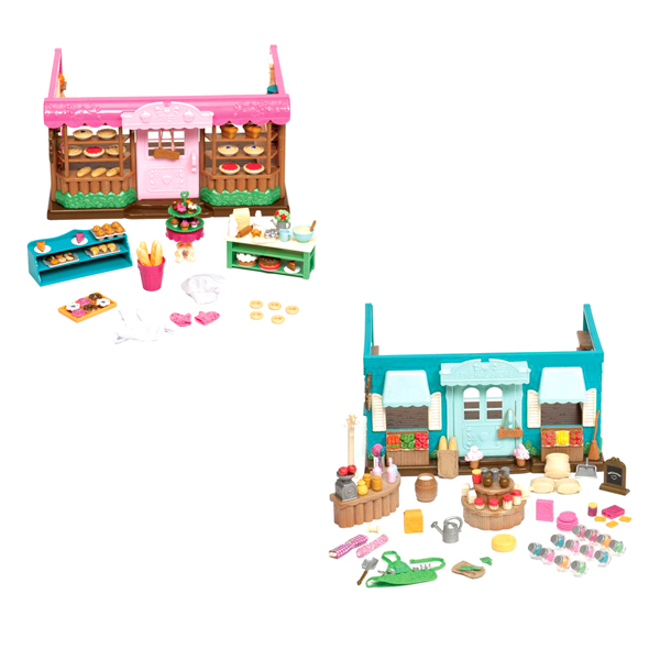 Набор игровой Лил Вудзис (Li'l Woodzeez) магазин с бирюзовой крышей с аксессуарами - многочисленными продуктами, которые можно расставить по витрине. На входе можно повесить табличку "Добро пожаловать", по бокам от двери располагаются прилавки с продуктами. Здесь продается все необходимое для маленьких зверьков: домашние соленья, баночки с вареньем, свежие овощи и фрукты, орешки и шоколад, мука и молочные продукты. Все продукты выложены внутри магазина на деревянных прилавках и стойках, чтобы покупатели могли их внимательно рассмотреть. В набор также входят фартук для продавца, метла, лопата, совок, лейка, грабли, семена. Игровые наборы Лил Вудзис (Li'l Woodzeez) прекрасно подходят к семейкам игрушки Лил Вудзис (Li'l Woodzeez).