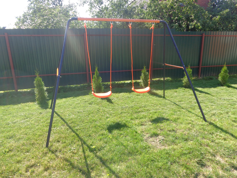 Сама конструкция имеет балки чтобы вкапывать их в землю, но мы пока без этого катаемся, я еще не определила где стоять будет)