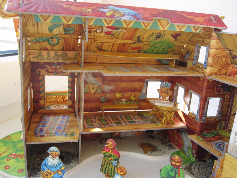 Сборная модель из картона.Картон плотный. Изба размером 27Х20Х19. В комплект входят фигурки,печь .Много красочных рисунков-на крыше баба Яга,гуси лебеди, дома прячутся домовые,на стенах русалка, леший..все приправлено долей юмора. Играем в сказки.Ребенок 2,7 доволен.