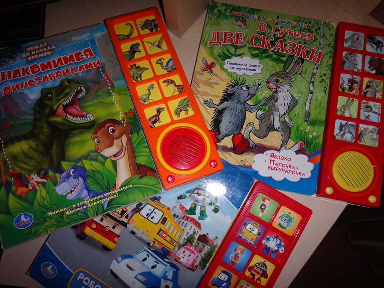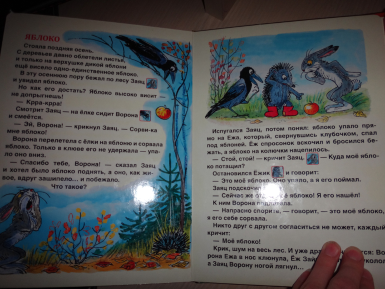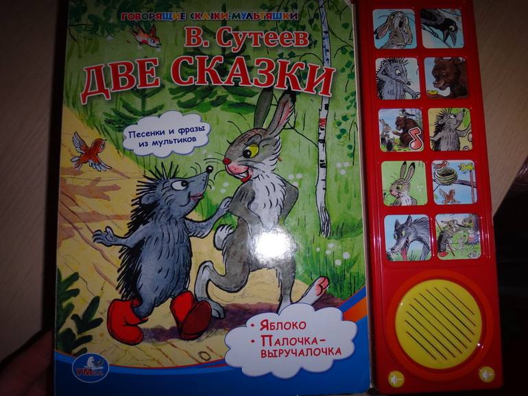 В книжки 2 сказки : Яблоко и палочка выручалочка. Кнопки озвучины голосами героев ,говорят предложениями из сказок .Есть кнопочка с песенкой про яблочко .