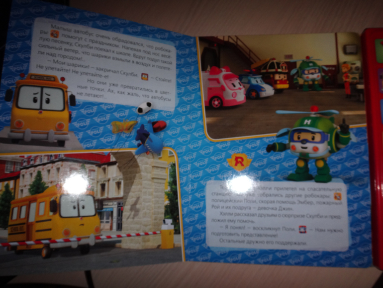 В книги описан одна серия из мультика : ! Про Скулби и воздушный шарик" . Кнопочки озвучивают фразы героев из мультика по этой серии.