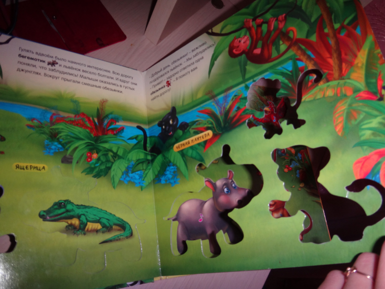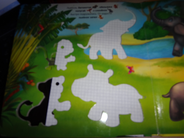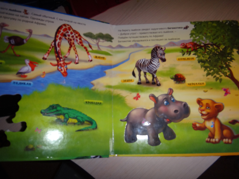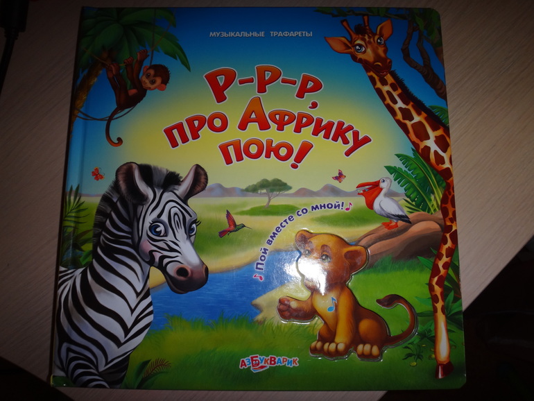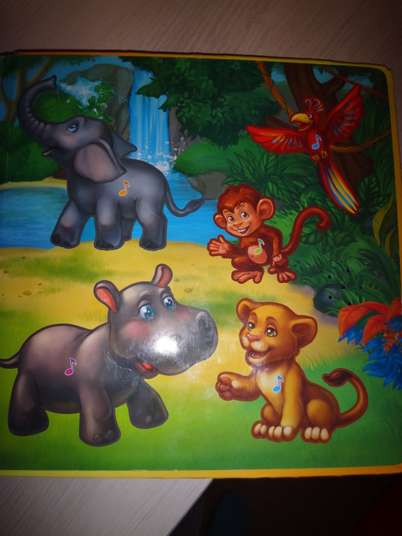 Поет песенку львенок очень веселую и зажигательную и при нажатие на животных можно услышать как они издают звуки .Книжка трафарет .Под каждого героя можно положить листок и обвести его контур