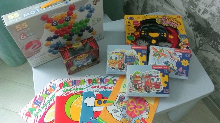 Детали мозайки большие. Посмотрим заинтересует ли? Коробочки пазлы малявочки такие. Раскраски классные как раз для нас, крупные такие.