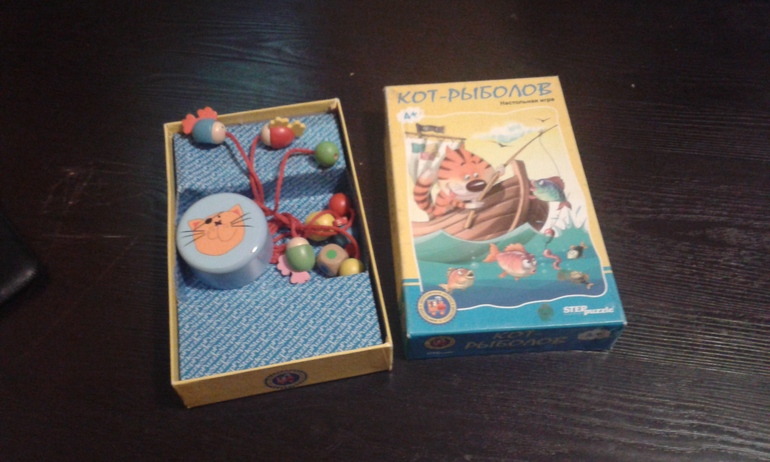 А давайте хвастаться))))))))))Покупали давно , но отзыв только сейчас...Все просто кот , крышечка с кошачьей мордочкой , ловит рыбок , кидаем камень и какой цвет выпал такого цвета рыбку ловим , игок рыбка должен ловко успеть дернуть шнурок чтобы не попасть коту в лапы.
