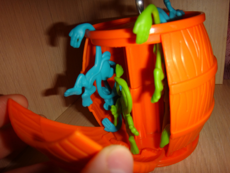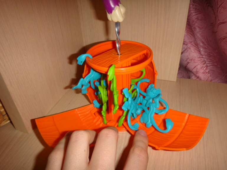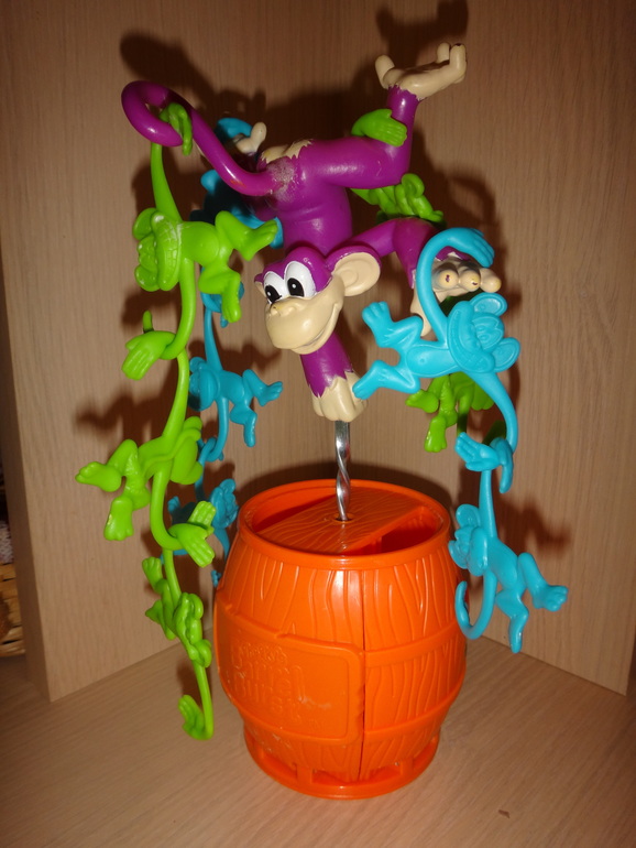 Сейчас стоит всего 334 р . . Обезьянка на бочке ,при нажатии на обезьянку ,бочка раскручивается как юла и раскрывает свои " лепестки " , а от туда вылетают 10 обезьянок ( 5 зеленых и 5 голубых)