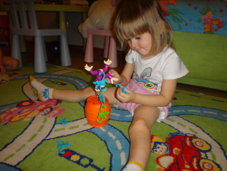 Дочка играла в нее еще совсем маленькая : складывала их в бочку ,завлекала ее на минут 15 точно . Теперь мы подросли и играют уже вдвоем ,визг,писк точно вам обеспечен ))