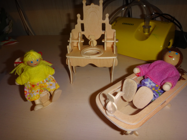Кстати набор сборной мебели МДИ ,намного хуже собирается : деталей много , особенно сложно дался туалет , все кривые - без горячего клея точно тут не обойтись ,потому что стыки не совпадают и приходилось клеять .детали хрупкие - по всей пластины была трещина . Но размер меня порадовал .Моим куколкам там удобно ) прям по размеру ))