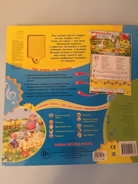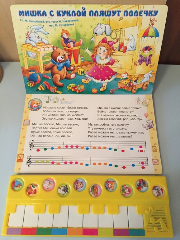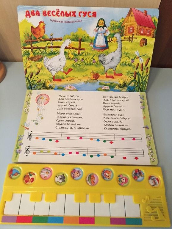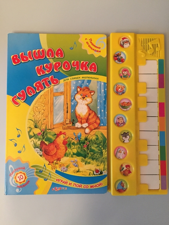 книжки-пианино наше все)) супер хит у детей. Книга довольно большого размера, звук очень приятный и чистый.