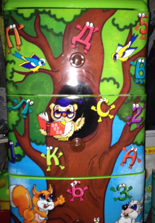 Свершилось! Я все-таки нашла салатовый непрозрачный пластиковый комод. Да еще и с приятным бонусом в виде нарисованного мудрого филина. Дочь балдеет от совушек разных. Как увидела в парке деревянного филина, так и влюбилась. Хороший комод. Жаль только, что ящики не крепятся, то есть их можно полностью вытащить, но мы уже защелки поставили защитные, так что не страшно. В остальном - претензий нет, вместительный, устойчивый.