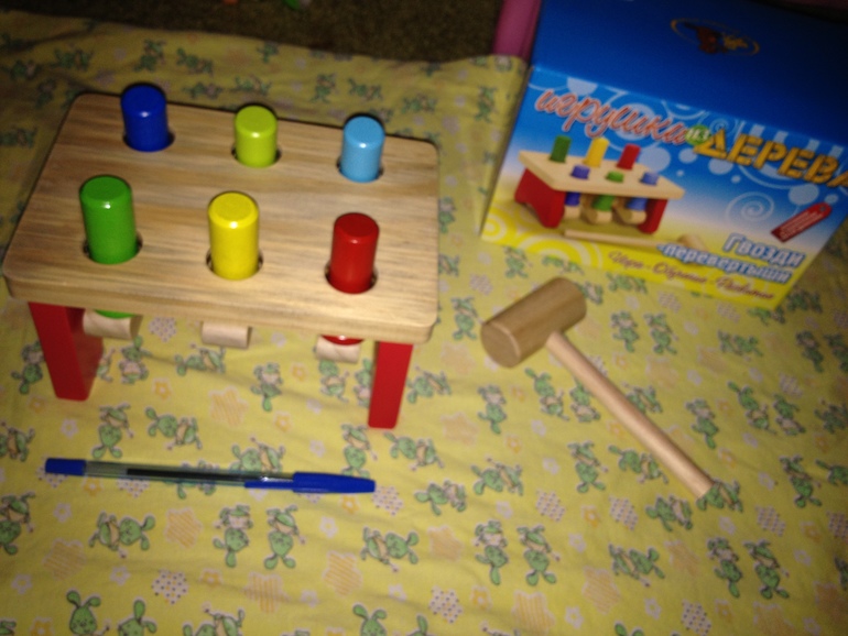 Стучалка-забивалка. Забиваешь гвоздик - вылезает гвоздик напротив. Дочери пока сложно самой забивать, просит меня. Сижу и стучу. Антистресс прям. Молоточек не тяжелый.