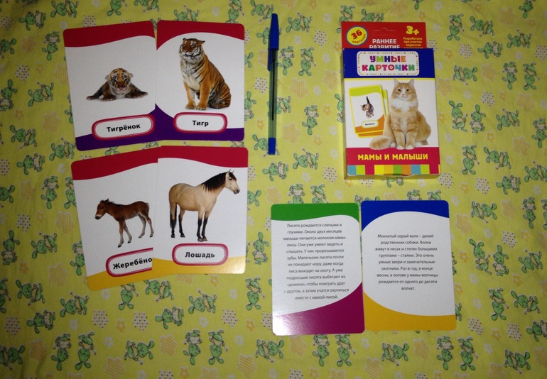 Красивые карточки, рисунки не мультяшные. Где чья мама, ребенка пока не волнует, но по-своему она карточки как-то раскладывает и ищет знакомых зверюшек. На обороте общая информация о животном.
