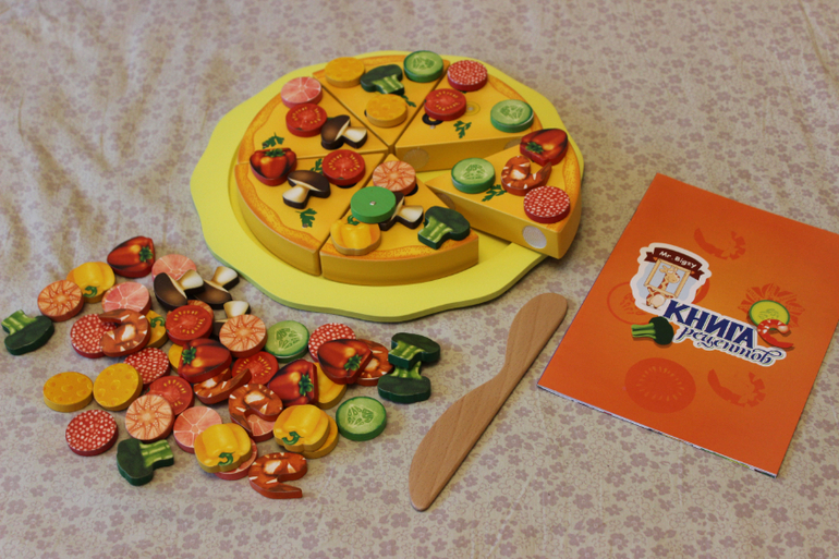 Игра Давно на нее облизывалась и все же решила заказать. Качество на высоте, все детали из качественного, гладкого дерева, продукты (их в наборе 66 штук) крепятся к основе при помощи магнитов, а куски пиццы соединены между собой липучками. В комплекте ножик, при разрезании которым, раздается характерный аппетитный треск). Также в наборе книга рецептов, т.е. заданий. Упакована в красочную коробку.