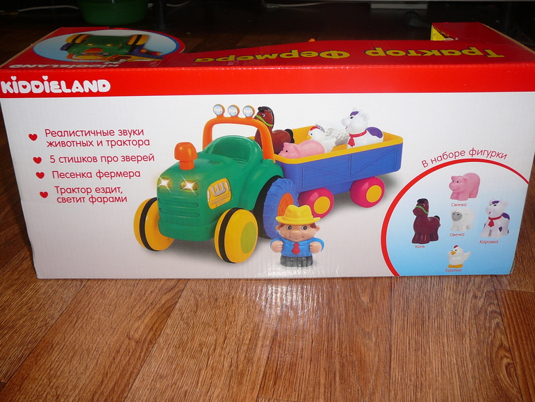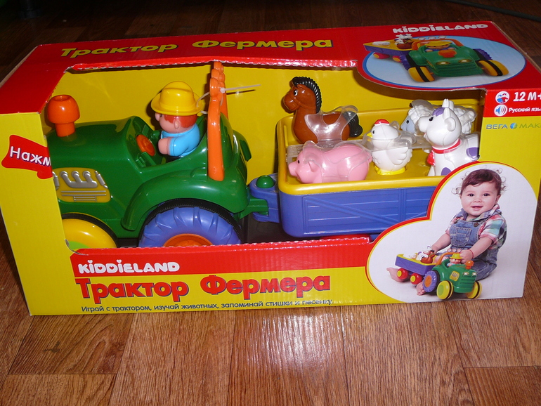Очень хотела приобрести для дочки развивающую игрушку.Нравились "Домик мечты"и "Ноев ковчег".Все думала,какую игрушку выбрать.А тут как раз акция была в "Майшопе"на .Скидка была очень хорошая.Вместо 2400руб.,стоил 1950+скидка 25% Ну и я,конечно,долго раздумывать не стала и "урвала" по распродаже этот чудесный трактор.И вот он к нам приехал.Игрушка упакована в коробку,она такая не маленькая.В комплекте с игрушкой идут фирменные батарейки,правда,работали они недолго. На следующий день поставили свои батарейки.В комплект входит трактор с прицепом,5 фигурок животных,фигурка фермера.Игрушка очень качественная, выполнена из крепкого пластика.Мне кажется,что поломать его очень сложно.Животные рассказывают стихи и издают звуки.Трактор выполняет еще и роль сортера,животных надо правильно рассадить в прицепе,тогда они расскажут стихи.Фигурка фермера вынимается,он поет песенку,если его посадить в трактор.Если нажать на трубу,то трактор поедет.У трактора мигают фары. В общем,игрушка очень классная!Всем советую!