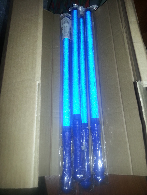 Ещё после испытаний выдам "мечи" или светящиеся палочки. Сражаться на них конечно нельзя, но поиграть очень даже здорово. 3 режима свечения. Упаковали на славу! Нам все 4 пришли синие.